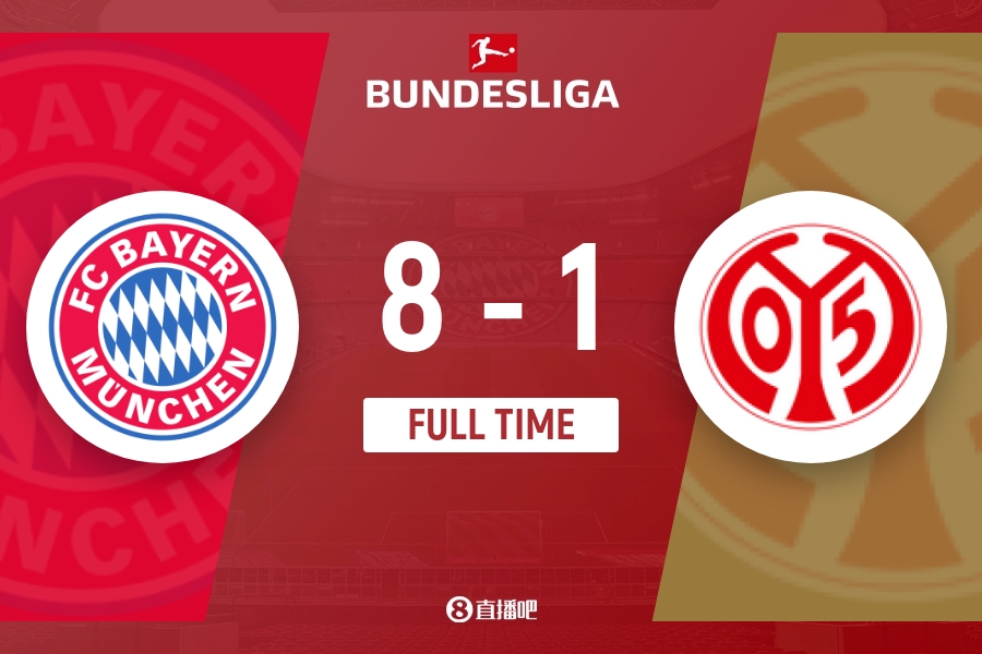 下半场伤停补时3分钟,全场比赛结束,最终拜仁8-1美因茨。