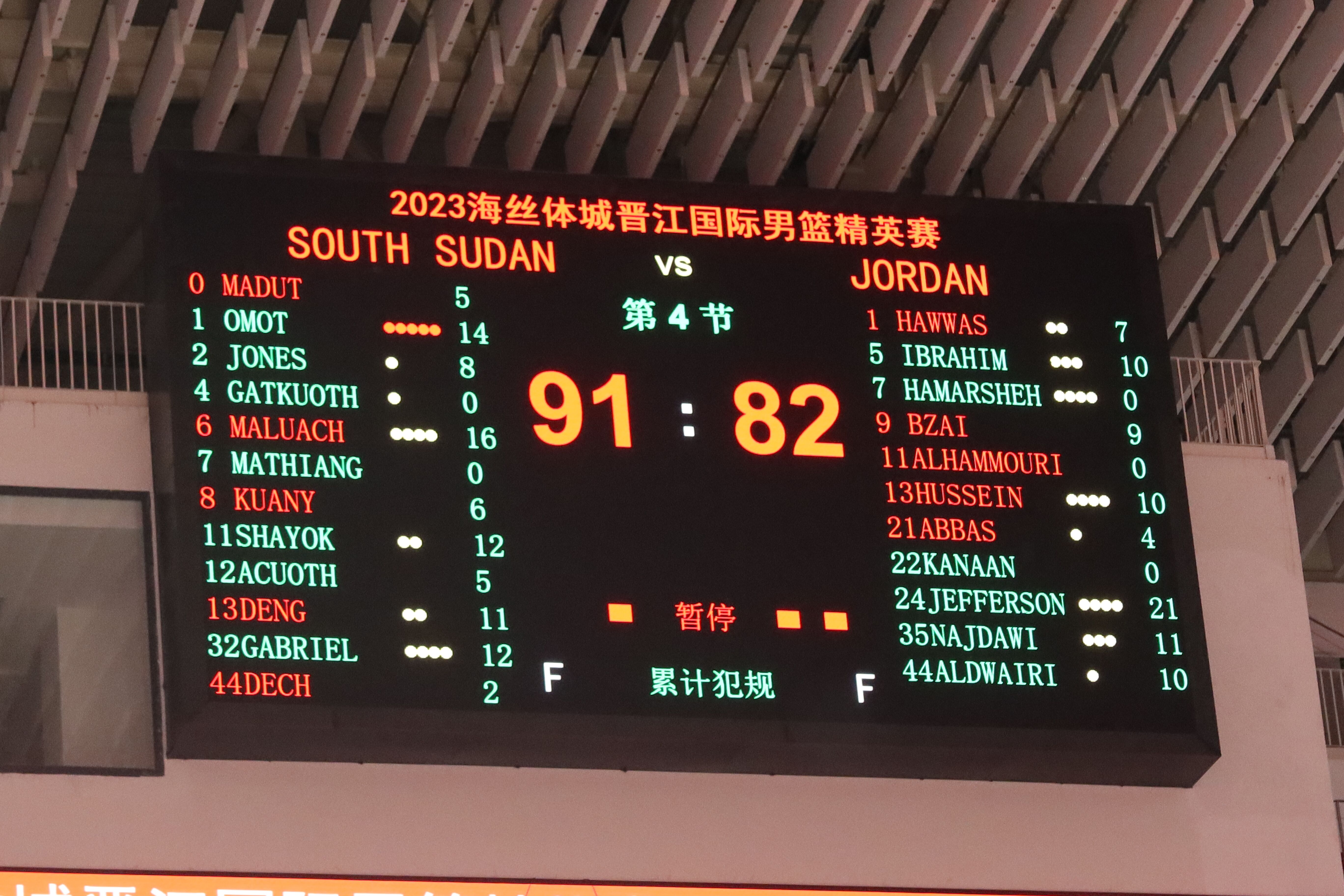 一开场,双方互送8-0的攻击波,此后南苏丹持续发力完成11-1的攻势取得两位数领先,约旦内外开花努力追赶,但南苏丹攻防两端优势明显,再度打出11-1的攻击波一度将优势扩大到20分以上,半场战罢南苏丹53-38领先15分。下半场,约旦不断冲击内线连投带罚拿分缩小分差,南苏丹多点开花打成12-2的高潮重获20分优势,末节南苏丹命中率有所下降,约旦连续冲击篮筐稍稍迫近比分,马鲁阿奇连续暴扣强势回应。最终,南苏丹91-82击败约旦。