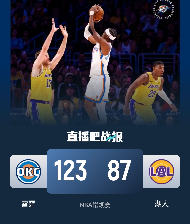 比赛开始,雷霆反客为主打出6-0的开局,湖人展开反击,蒂米内外开花独得10分帮助球队顽强咬住,以赛亚·乔外线开炮连中3记三分,湖人极为顽强,八村塁内外开花抹平分差,卡鲁索力战旧主连中2记三分,雷霆打出11-0的攻击波确立两位数优势,半场战罢雷霆65-47领先湖人。易边再战,八村塁连续暴扣,但雷霆打出16-3的攻击波扩大优势,亚历山大反击将分差拉开到30分,末节雷霆延续火力一度将优势扩大到40分,双方轮换阵容耗完剩余时间。最终,雷霆123-87大胜残阵湖人,最近两战湖人共赢了79分,球队迎来6连胜。