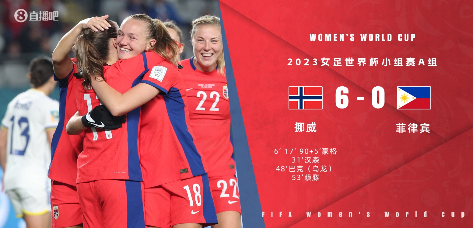 7月30日讯 北京时间7月30日15:00,女足世界杯小组赛A组第三轮挪威迎战菲律宾的比赛,上半场豪格头顶脚踢完成双响,汉森远射世界波,半场结束,挪威女足3-0菲律宾女足。下半场巴克摆乌龙,赖腾点射,哈里森被罚下,豪格戴帽,最终挪威女足6-0菲律宾女足晋级淘汰赛。