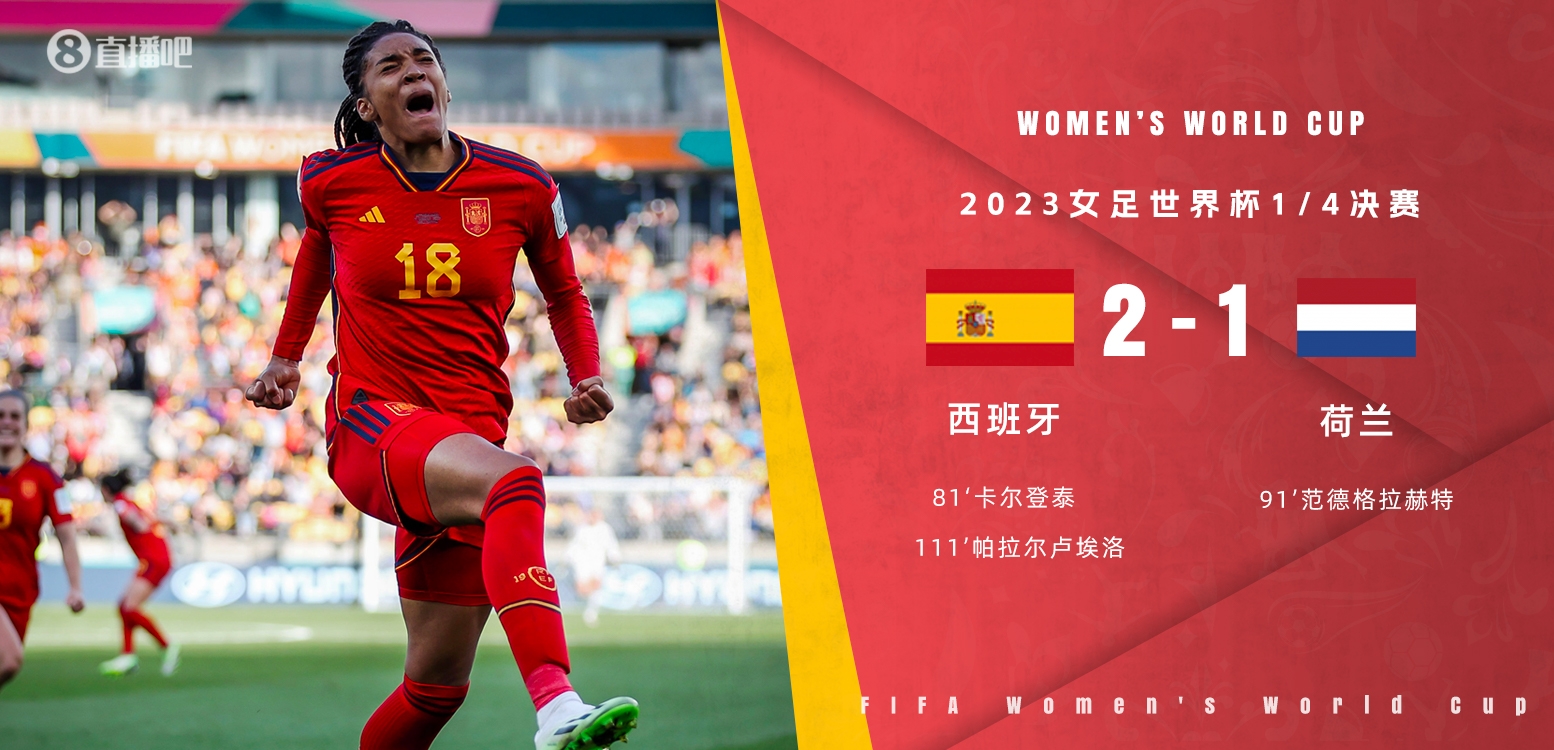 直播8月11日讯 北京时间8月11日上午9:00,女足世界杯1/4决赛,西班牙女足对阵荷兰女足。上半场,雷东多两连击中柱,冈萨雷斯越位进球。下半场,贝伦丝特恩造点但被取消,范德格拉特送点,卡尔登泰点射,范德格拉特抽射绝平拖入加时。加时赛下半场,帕拉尔卢埃洛一锤定音。全场结束,西班牙女足2-1荷兰女足。本场过后,西班牙将在下一轮对阵日本女足和瑞典女足的胜者。