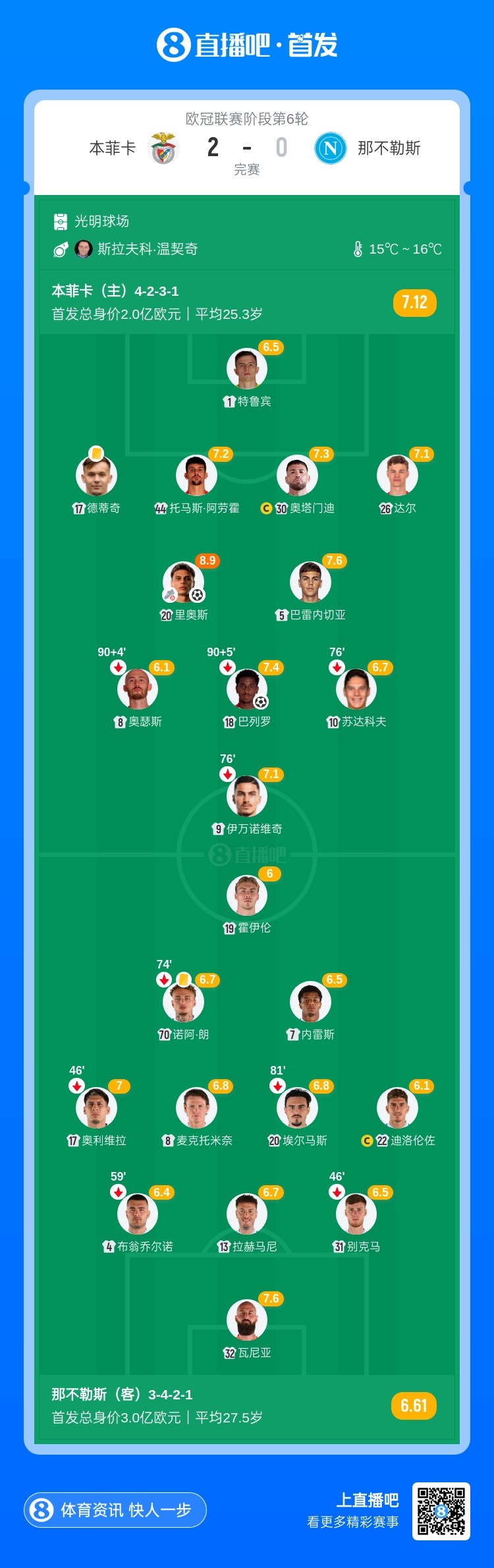 穆帅胜孔蒂!本菲卡2-0那不勒斯 里奥斯传射巴列罗精彩脚后跟破门