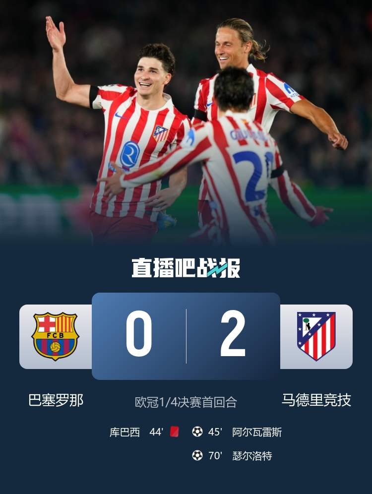 4月9日讯 北京时间4月9日凌晨3:00,欧冠1/4决赛首回合,巴萨坐镇诺坎普迎战马竞。上半场拉什福德进球因亚马尔越位在先被吹掉,坎塞洛低射造险,库巴西被直红罚下,阿尔瓦雷斯任意球世界波直接破门,马竞暂1-0巴萨;下半场瑟尔洛特再下一城,最终马竞2-0十人巴萨,占据晋级先机。