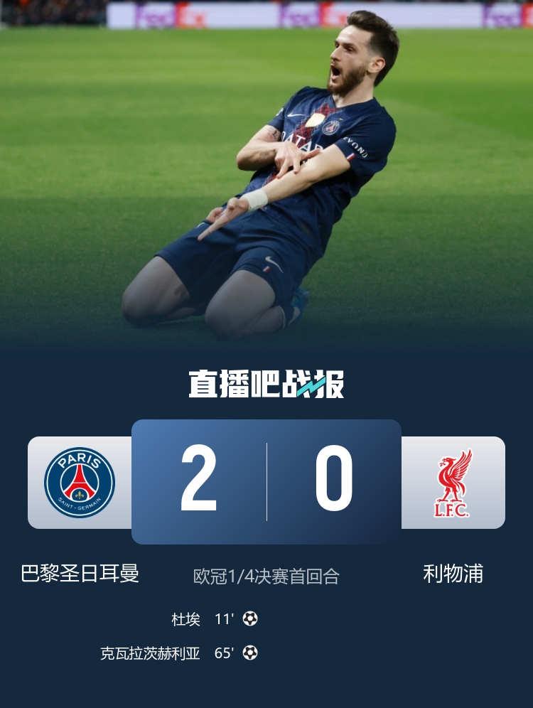 4月9日讯 北京时间4月9日凌晨4时,欧冠四分之一决赛首回合,巴黎坐镇王子公园球场迎战利物浦。上半场,杜埃破门首开纪录,利物浦半场仅有1次射门,没有完成射正。巴黎半场1-0领先利物浦。下半场,内维斯送出助攻,克瓦拉茨赫利亚扩大领先优势。最终巴黎2-0击败利物浦,两队次回合比赛将于北京时间4月15日凌晨3时移师安菲尔德球场进行。