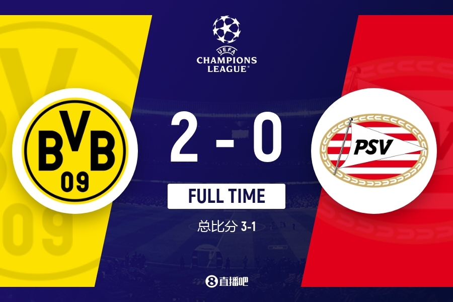 下半场补时5分钟。最终全场比赛结束,多特2-0埃因霍温。