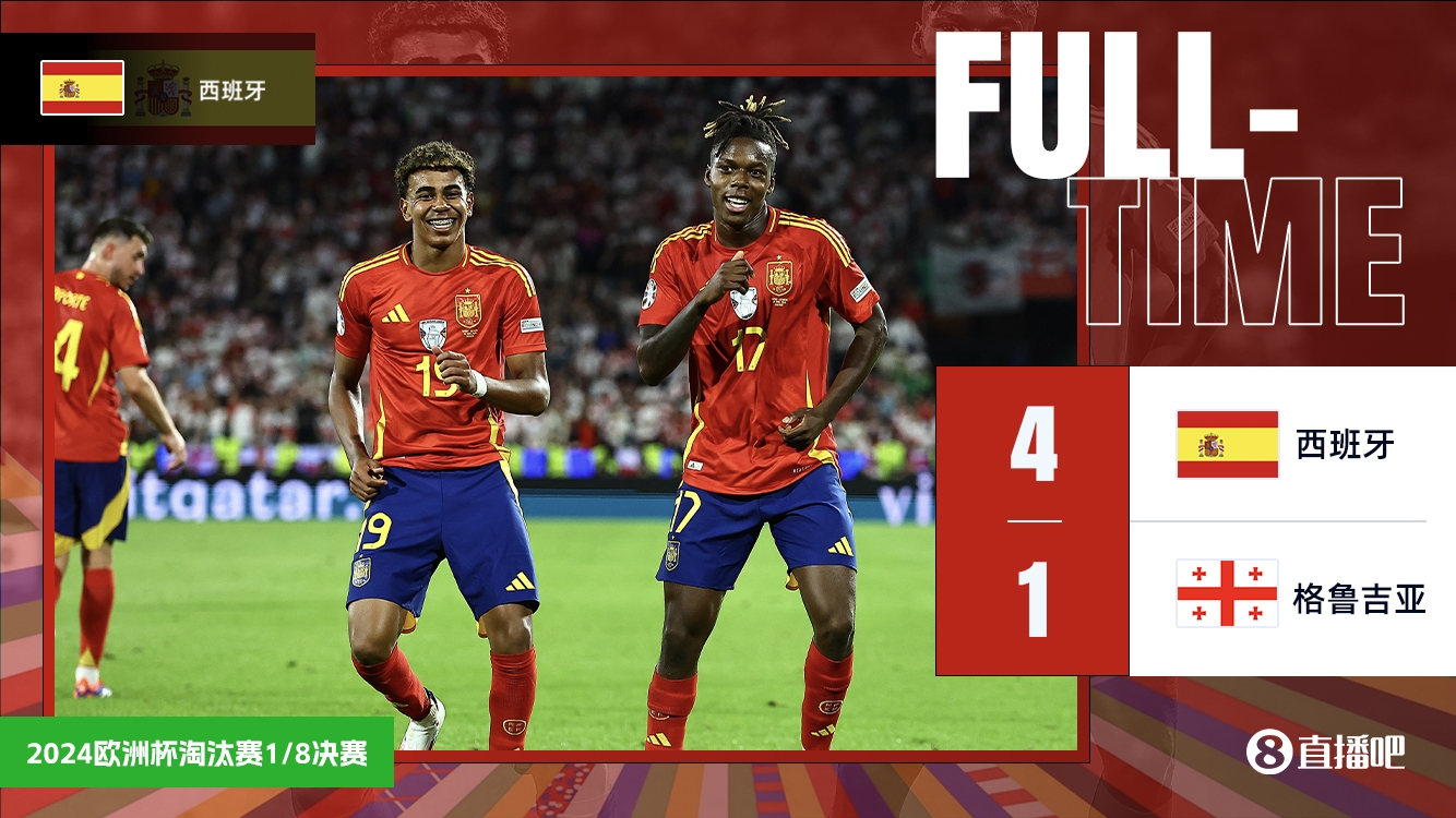 7月1日讯 欧洲杯1/8决赛,西班牙对阵格鲁吉亚。上半场,勒诺尔芒自摆乌龙,罗德里贴地箭扳平。易边再战,亚马尔助攻法比安头槌破门后造乌龙被吹越位,尼科、奥尔莫建功。最终西班牙4-1格鲁吉亚晋级八强,1/4决赛...发表于:07月01日