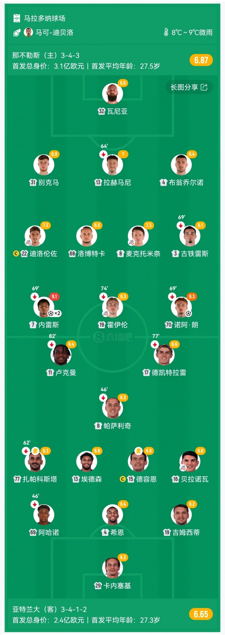 下半场补时5分钟。最终全场比赛结束,那不勒斯3-1亚特兰大。