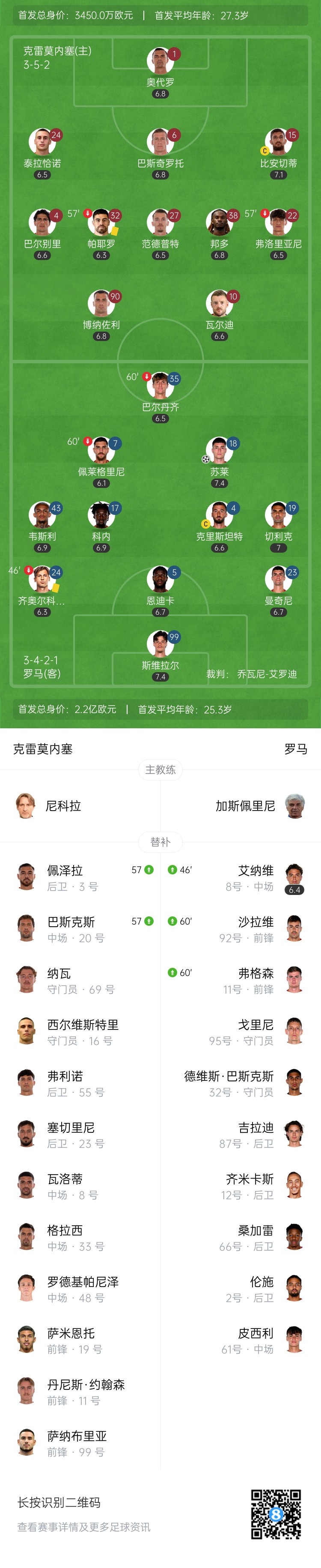 伤停补时4分钟。全场比赛结束,克雷莫内塞1-3罗马。