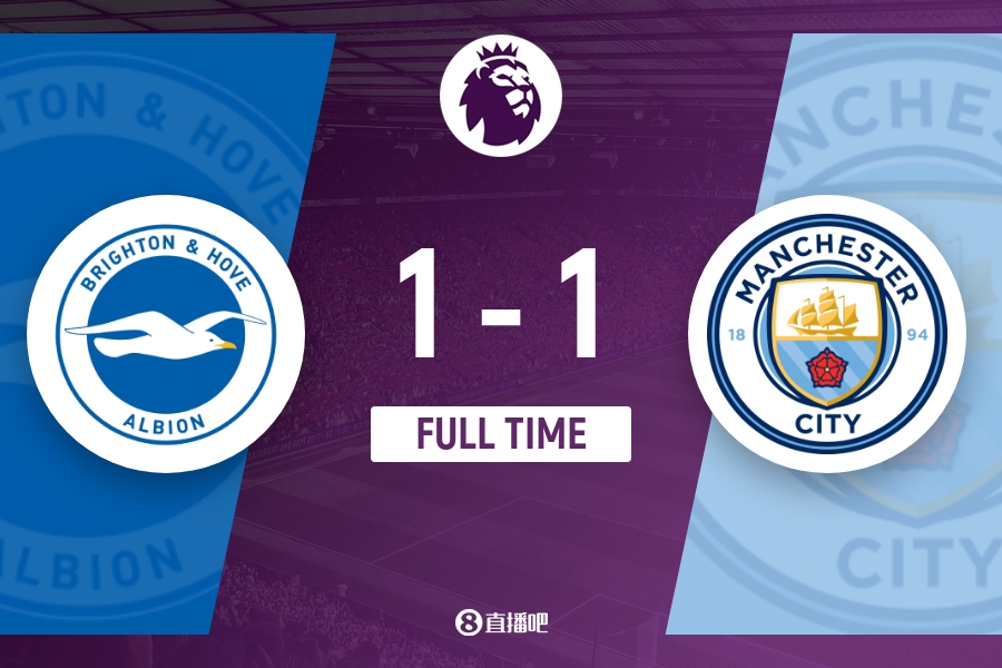 下半场补时4分钟。最终全场比赛结束,布莱顿主场1-1曼城。