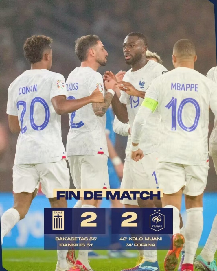 11月22日讯 欧洲杯预选赛第10轮,法国客场挑战希腊。上半场吉鲁助攻穆阿尼破门,易边再战,巴卡斯塔斯、伊奥尼迪斯5分钟连入两球,姆巴佩助攻福法纳世界波扳平比分,尾声阶段、科曼、姆巴佩连续中框。最终法国2-2希腊。积分榜方面,法国队7胜1平不败收官榜首出线,希腊4胜1平3负小组第三将参加附加赛。