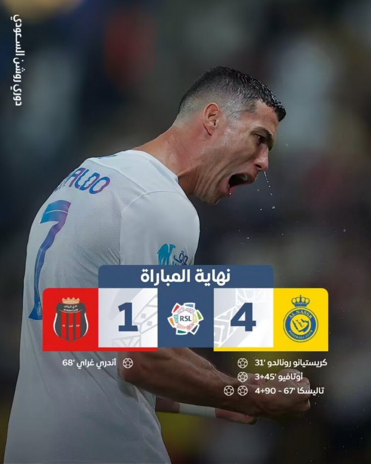 沙特联-C罗1200场里程碑之战传射建功 胜利4-1体育距榜首7分