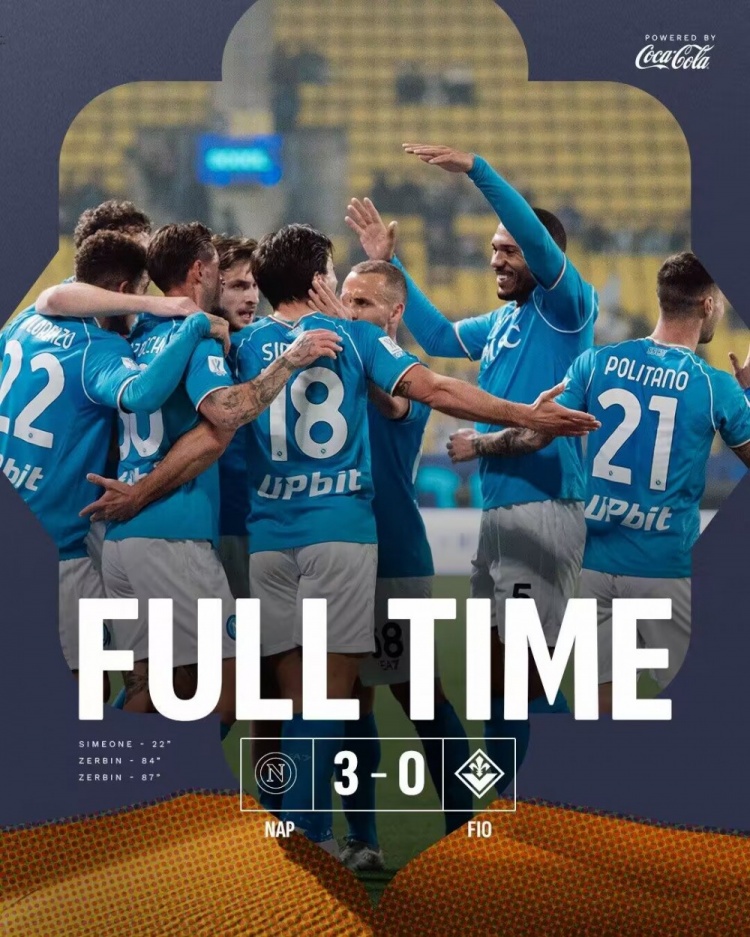 1月19日讯 北京时间1月19日凌晨3时,意大利超级杯半决赛,那不勒斯对阵佛罗伦萨。上半场,小西蒙尼首开纪录,随后伊科内罚丢点球。那不勒斯半场1-0领先佛罗伦萨。下半场,替补登场的泽尔滨打进两球。最终那不勒斯3-0击败佛罗伦萨,晋级意大利超级杯决赛,将对阵拉齐奥与国米之间的胜者。