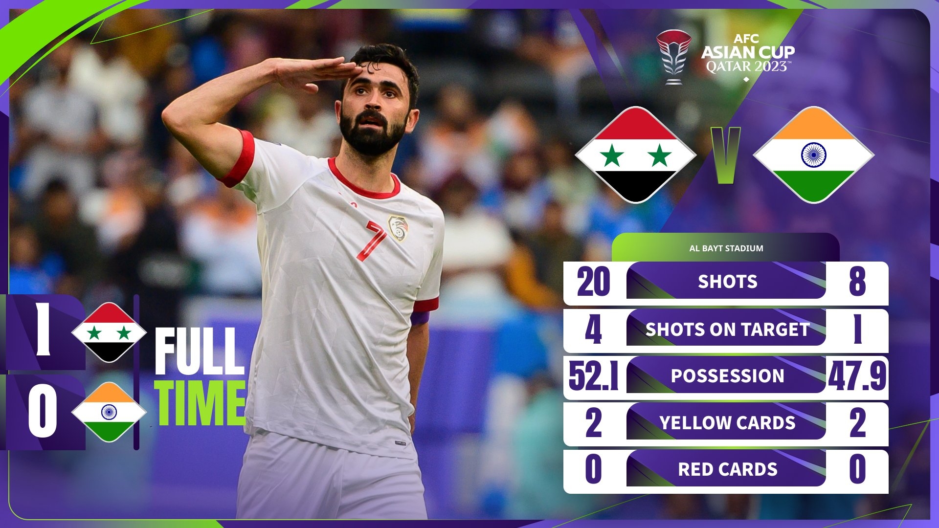 1月23日讯 北京时间1月23日19:30,亚洲杯小组赛B组第三轮叙利亚迎战印度的比赛,上半场叙利亚攻势如潮但并未能打破僵局,韦斯染黄,半场结束,叙利亚0-0印度,国足仍保留小组出线希望。下半场赫里宾低射打破僵局,最终叙利亚1-0印度排名小组第三,同时国足无缘小组出线。