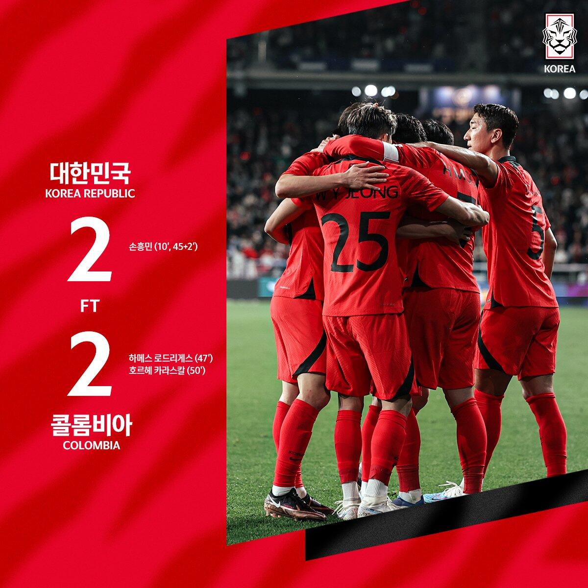 3月24日讯北京时间3月24日19:00,友谊赛韩国对阵哥伦比亚。上半场,哥伦比亚后场失误,孙兴慜兜射空门首开纪录;补时最后时刻,孙兴慜任意球破门完成梅开二度!下半场,J罗、卡拉斯卡尔五分钟内连入两球扳平比分。全场比赛结束,韩国2-2哥伦比亚!