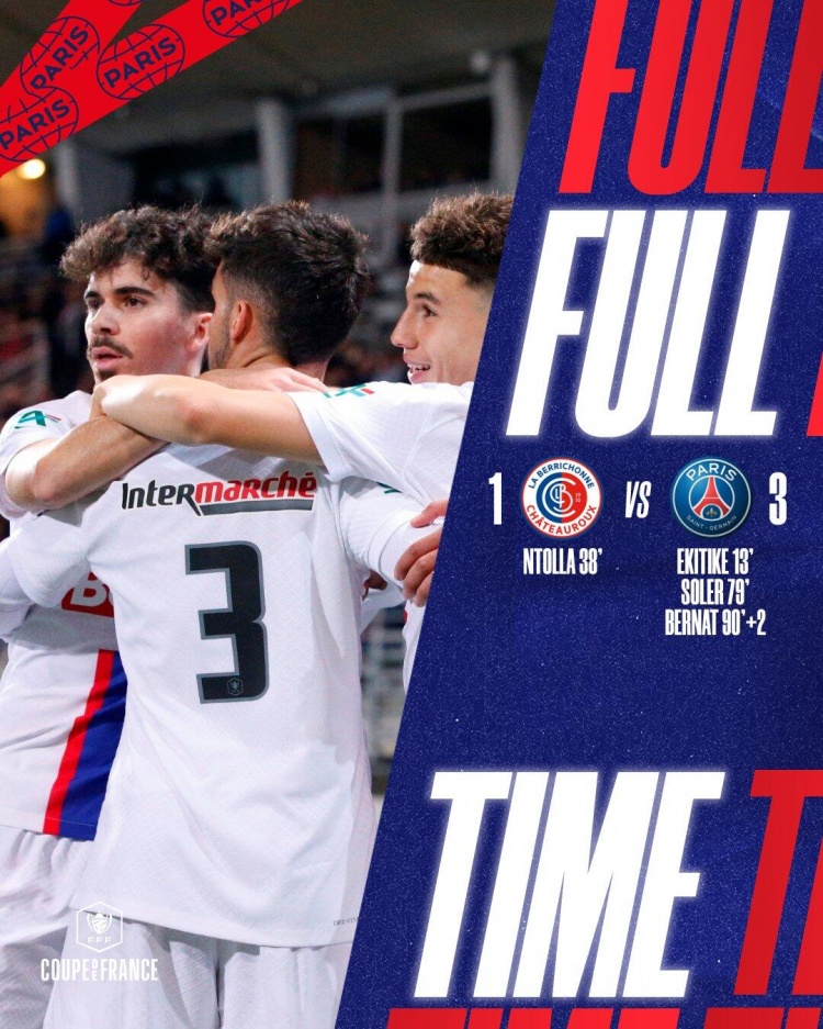 1月7日讯北京时间1月7日凌晨4:00,法国杯1/32决赛,沙托鲁对阵巴黎圣日耳曼。上半场,加尔比助攻埃基蒂克破门,恩托拉扳平比分。下半场,索莱尔破门再次为巴黎取得领先,补射阶段,贝尔纳特再入一球锁定胜局!巴黎圣日耳曼3-1沙托鲁晋级下一轮!