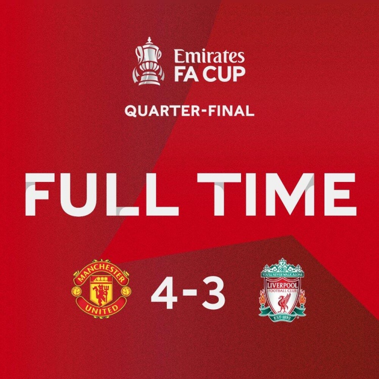 北京时间3月17日晚23:30,英格兰足总杯1/4决赛迎来双红会,红魔曼联坐镇主场迎战红军利物浦,上半场,麦克托米奈补射破门帮助曼联取得领先,远藤航破门被吹越位,麦卡利斯特扳平,萨拉赫反超比分,半场战罢,曼联1-2利物浦;下半场,安东尼禁区内转身射门打入绝平球,双方进入加时赛,加时赛埃利奥特禁区外远射折射破门,利物浦再次领先,麦克托米奈助攻拉什福德终场前扳平比分,终场前迪亚洛完成绝杀,最终全场比赛结束,曼联4-3淘汰利物浦晋级4强。