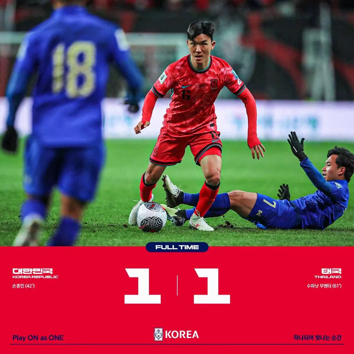 世亚预-韩国主场1-1泰国 太极虎积7分领跑&泰国3轮4分 孙兴慜破门