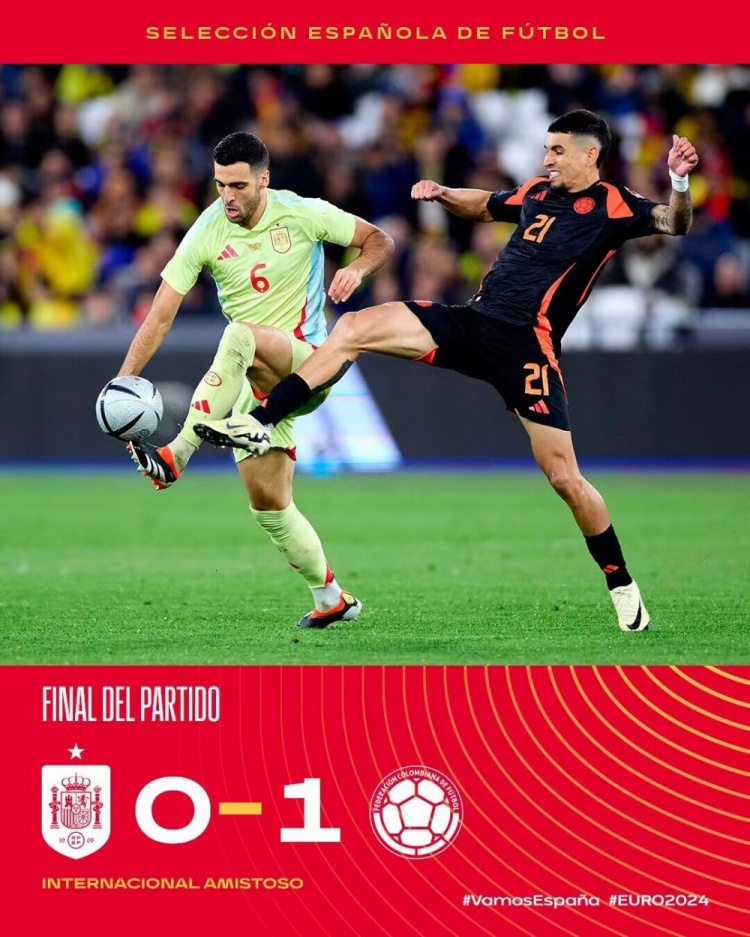 3月23日讯 国际友谊赛,西班牙对阵哥伦比亚。上半场双方机会寥寥破门乏术。易边再战,迪亚斯个人秀助攻穆诺斯凌空抽射制胜,17岁库巴西上演国家队首秀。最终全场比赛结束,西班牙0-1哥伦比亚。
