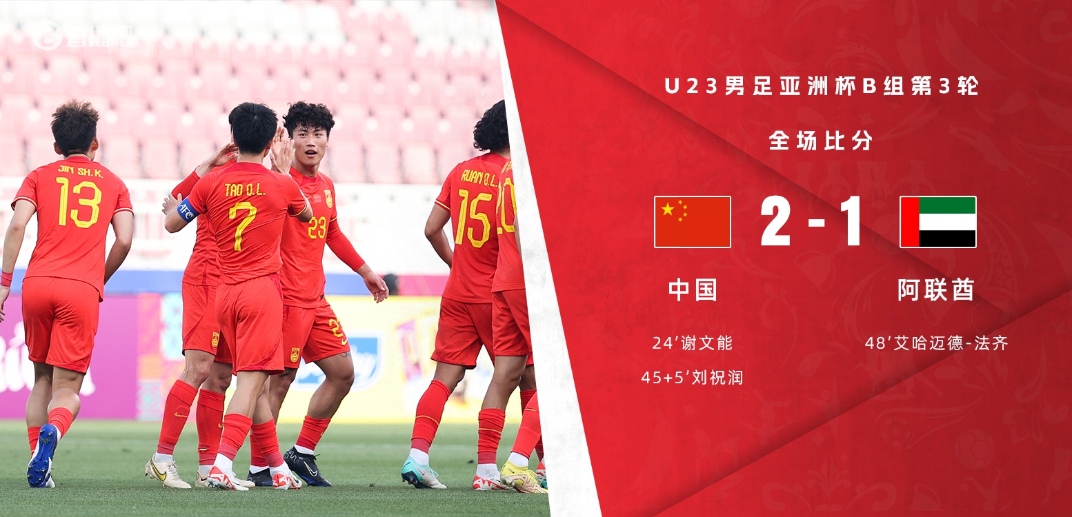 4月22日讯 北京时间4月22日晚21时整,2024年U23亚洲杯B组第3轮展开角逐,中国男足U23对阵阿联酋U23。上半场谢文能斩获赛事首球,拜合拉木造点被VAR取消,刘祝润扩大比分,下半场拜合拉木进球越位,阮齐龙防守失误致丢球。最终中国国奥2-1战胜阿联酋国奥,国奥时隔6年再次取得U23亚洲杯的胜利,本届国奥1胜2负位居B组第3名无缘出线。