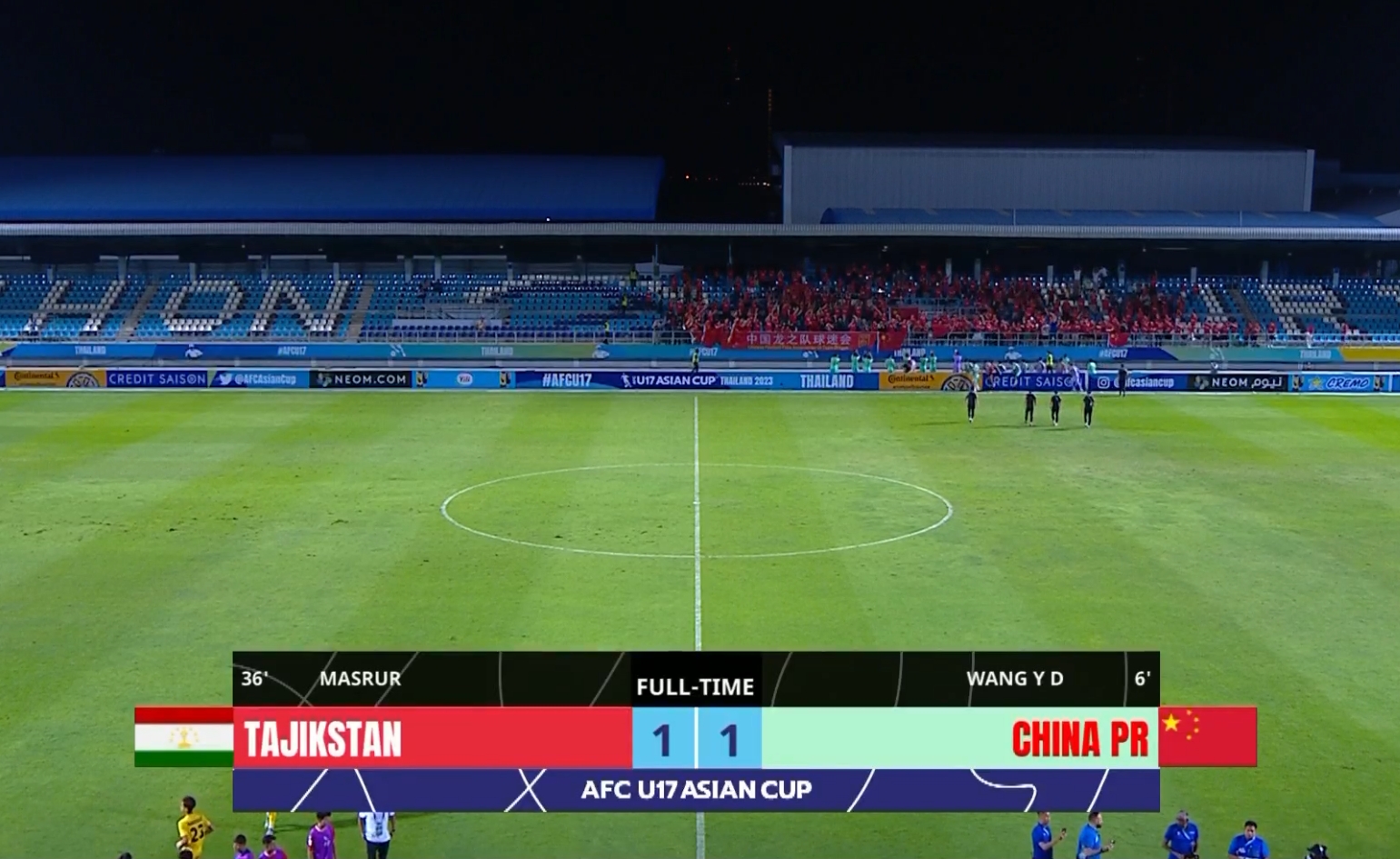 伤停补时8分钟。全场比赛结束, 中国1-1塔吉克斯坦。
