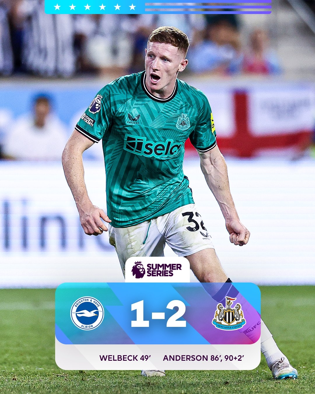 热身赛:纽卡2-1布莱顿 三笘薰助攻维尔贝克破门安德森双响绝杀