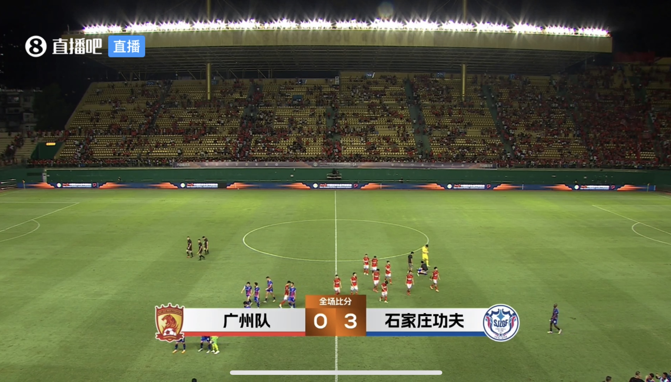 下半场补时4分钟。最终全场比赛结束,广州队0-3石家庄功夫。
