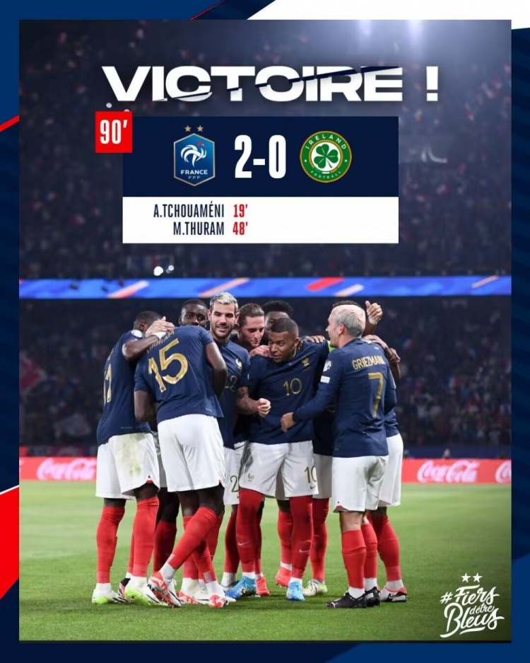 第47分钟,特奥左路倒三角回敲,姆巴佩打门被封堵,图拉姆转身扫射得手,法国2-0爱尔兰!↓