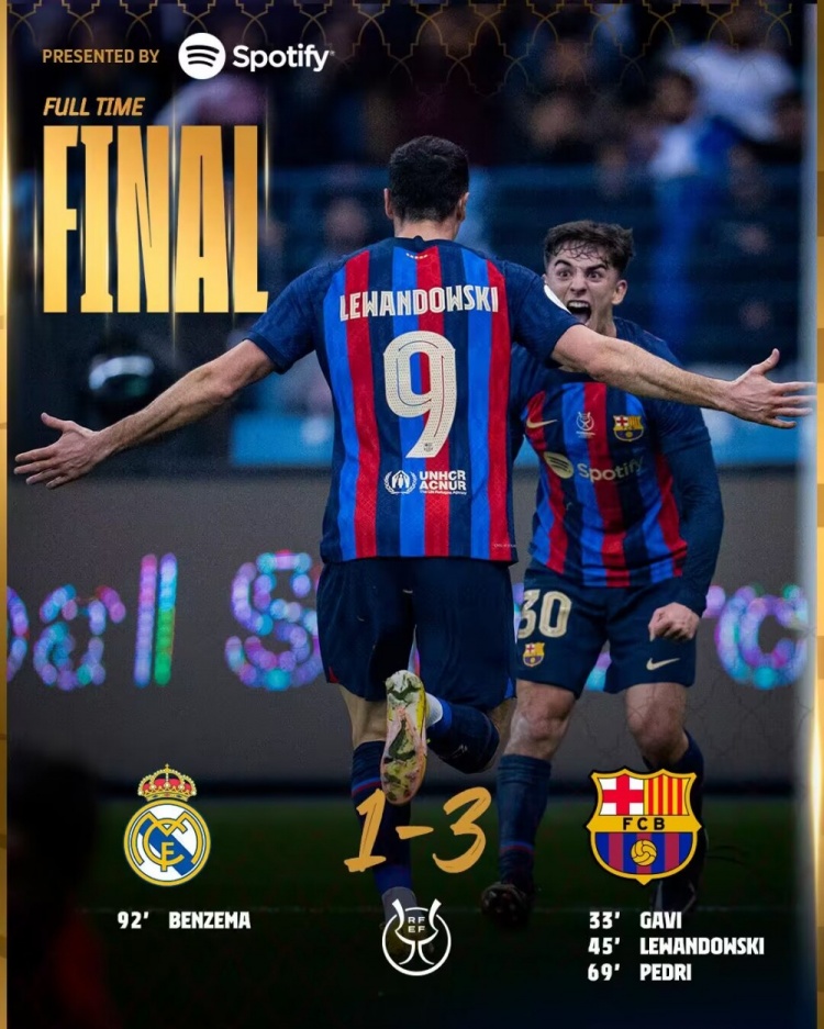 1月16日讯 北京时间1月16日凌晨3:00,2022-23赛季西班牙超级杯决赛,皇马对阵巴萨。上半场莱万加维互相送出传射,巴萨暂时2-0皇马;下半场佩德里破门,本泽马补时阶段打进一球,最终巴萨3-1击败皇马,第14次赢得西班牙超级杯冠军。