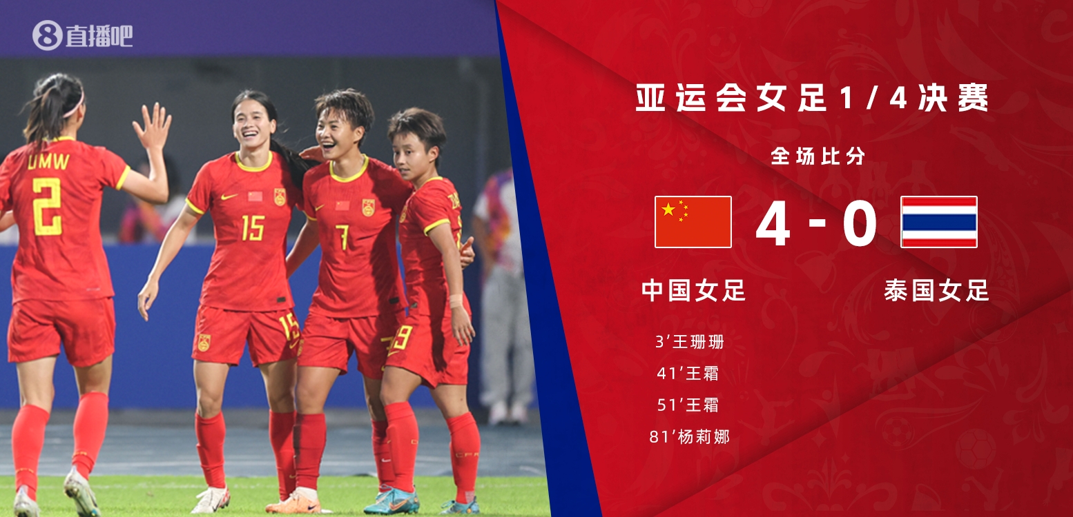 9月30日讯 北京时间9月30日晚上20:00,亚运女足1/4决赛,中国迎战泰国。上半场,王珊珊3分钟破门,张睿中框后助攻王霜得分。下半场,王霜头球再下一城,杨莉娜乱战进球。全场结束,中国4-0泰国。女足姑娘在半决赛中将迎战日本女足。