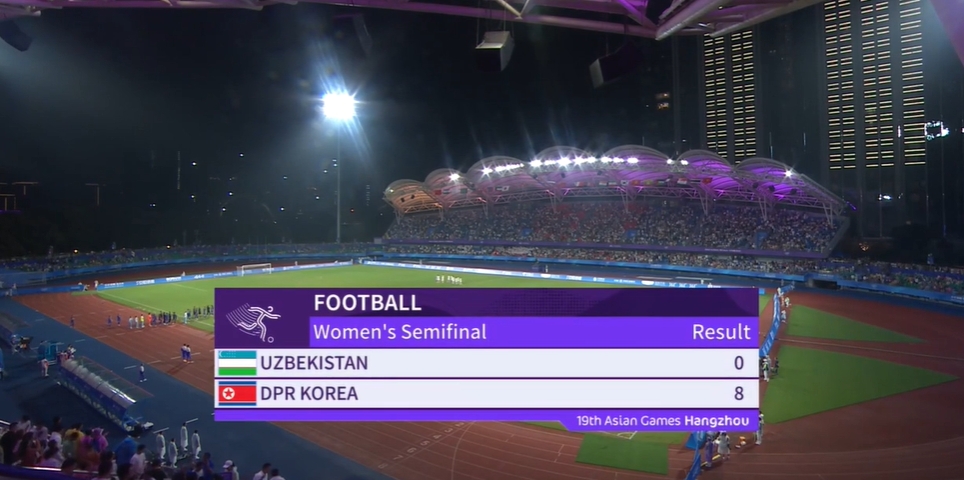 最终全场比赛结束,朝鲜女足8-0击败乌兹别克斯坦女足晋级亚运女足决赛。