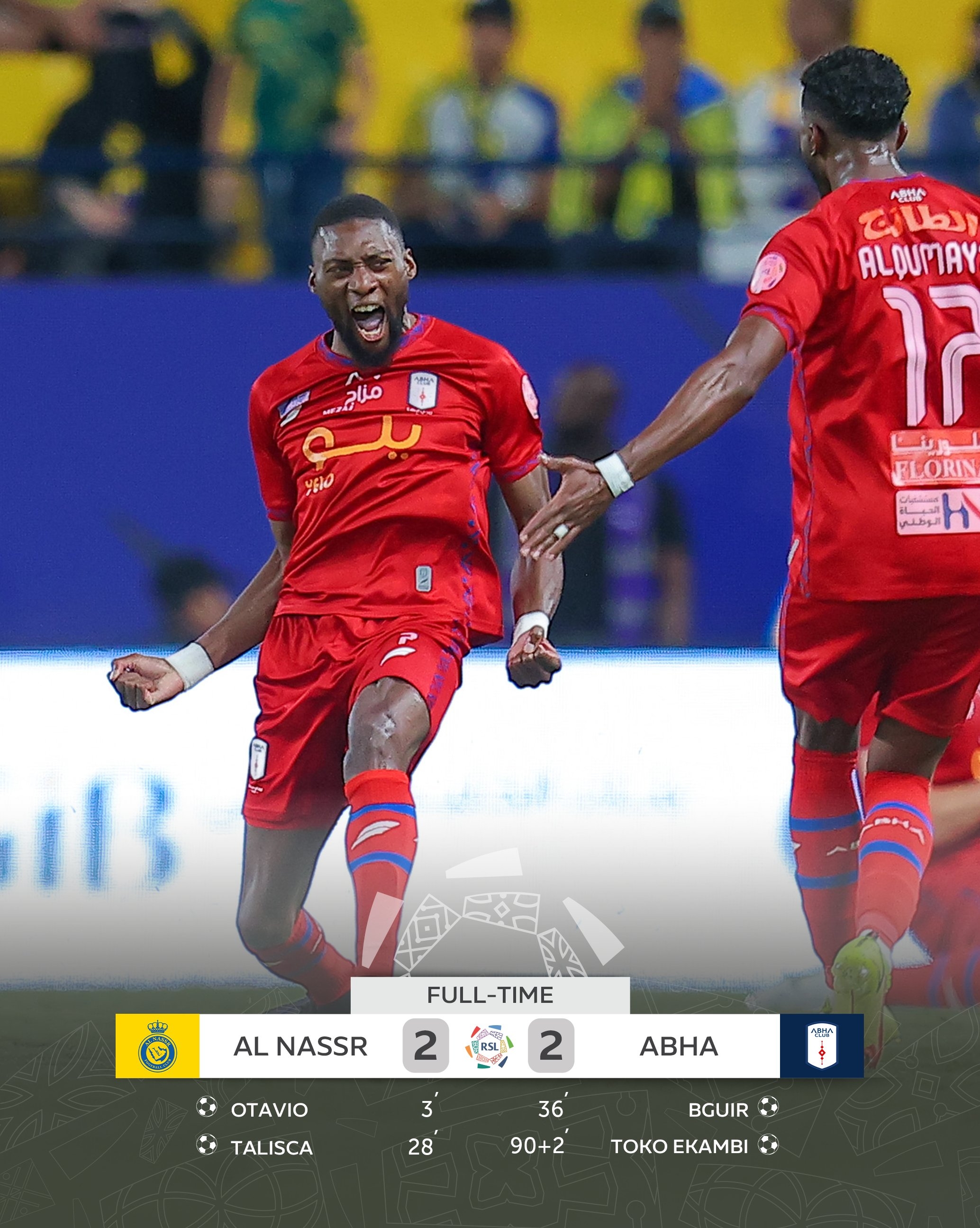第92分钟,埃卡姆比禁区外轰进世界波将比分扳平,艾卜哈2-2利雅得胜利。↓