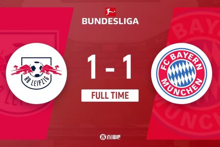下半场伤停补时4分钟,全场比赛结束,最终拜仁1-1战平莱比锡。