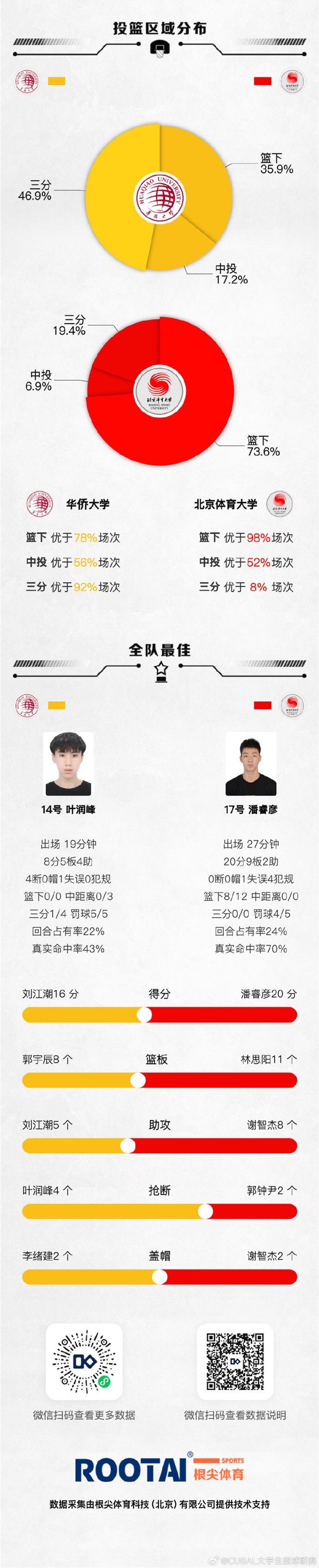 北京体育大学:杨腾飞 13分5篮板、林思阳10分11篮板、陈宇宸9分、鲁鹭8分5篮板、潘睿彦20分9篮板、谢智杰19分9篮板8助攻。
