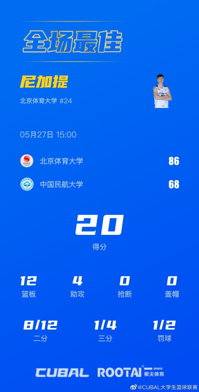 末节决战,尼加提上来又中三分,北体大抓反击,谢智杰妙传杨腾飞送出漂亮隔扣将分差再次拉开20分以上,随后中国民航进攻端略显急躁,接连单打误攻效果不佳,又是张汪群站出来接连外线发炮追分,谢智杰5犯被罚下,但张汪群也是连吃2T被直接罚出场,最终北体大86-68大胜中国民航,先下一城。