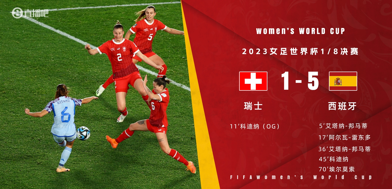 8月5日讯 北京时间8月5日13:00,女足世界杯十六强瑞士迎战西班牙的比赛,上半场邦马蒂双响,科迪纳回传乌龙球后将功补过抽射破门,雷东多头球建功,半场结束,西班牙女足4-1瑞士女足。下半场埃尔莫索抽射破门,最终西班牙女足5-1大胜瑞士女足首次晋级世界杯八强。