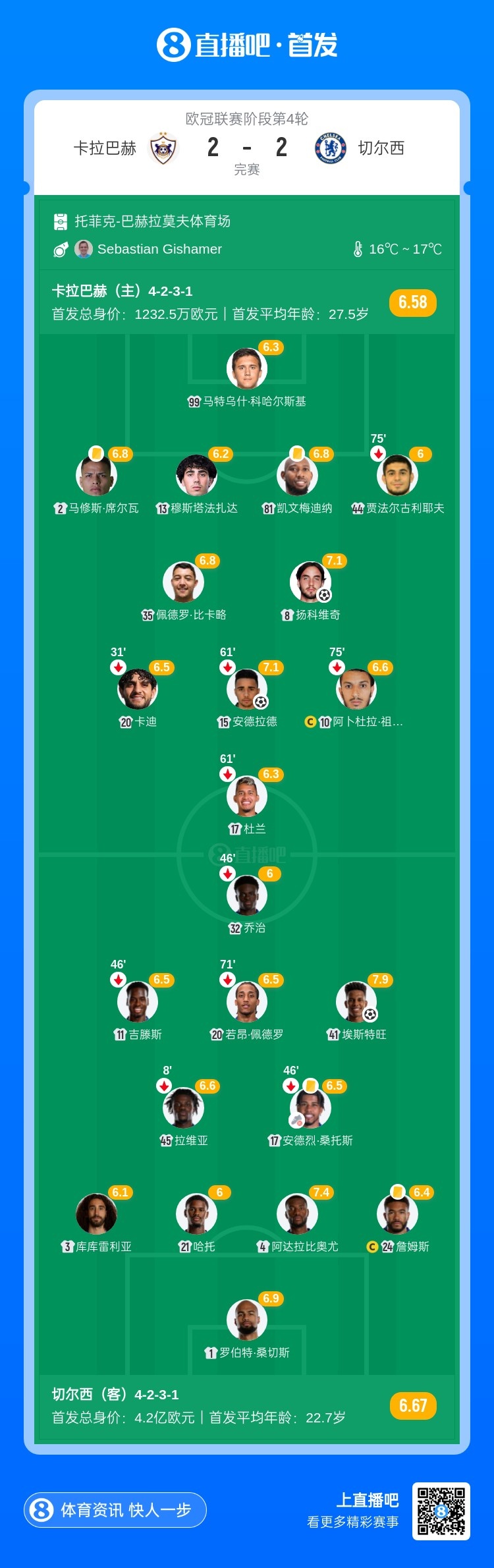 全场比赛结束,最终切尔西2-2卡拉巴赫。