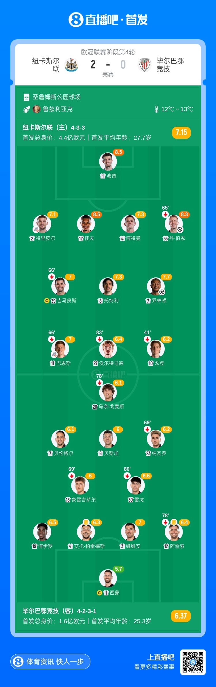 欧冠-纽卡2-0毕巴 丹伯恩、乔林顿头槌破门特里皮尔定位球助攻