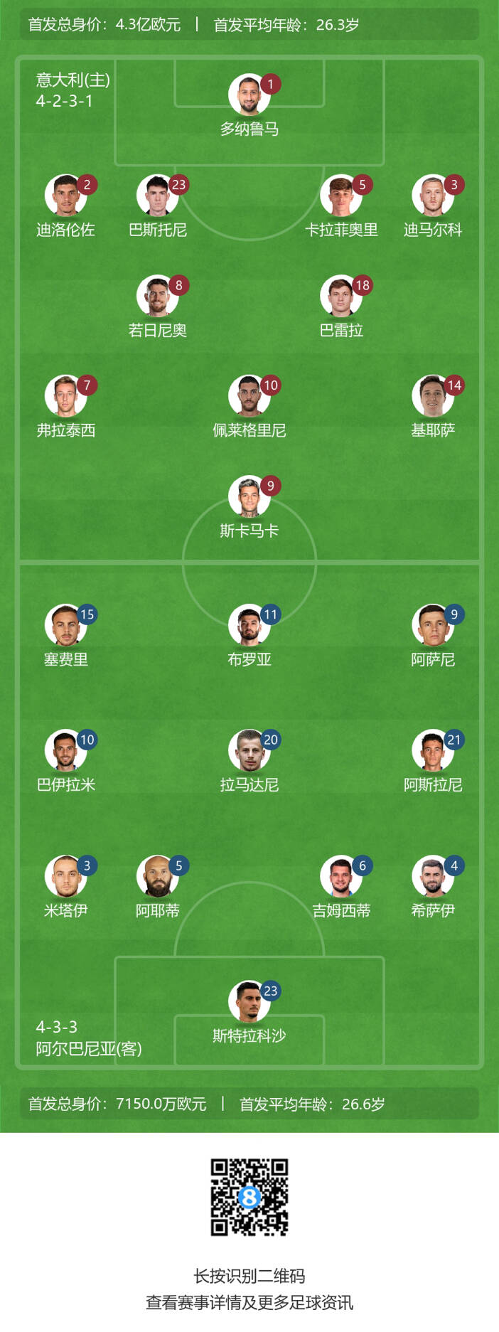 第11分钟,意大利角球机会,开了个短的!佩莱格里尼传中到后点,巴斯托尼头球破门!意大利1-1扳平阿尔巴尼亚↓