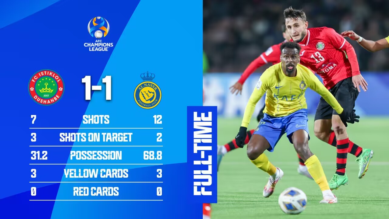 亚冠-利雅得胜利1-1杜尚别独立 小组赛4胜2平不败&E组头名收官
