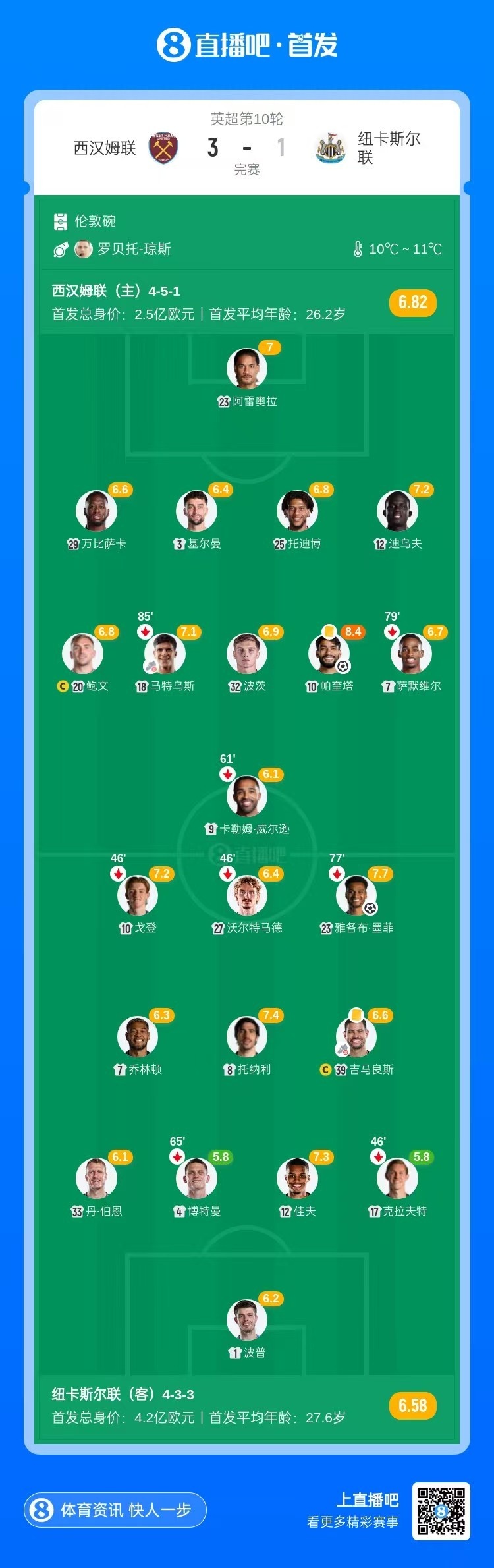 全场比赛结束,西汉姆联3-1纽卡斯尔联。
