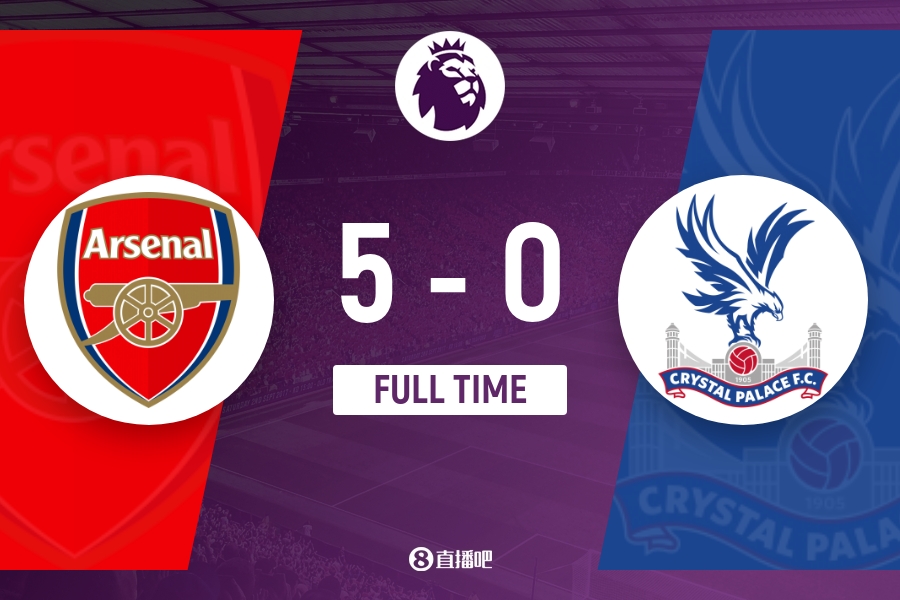 下半场补时6分钟,阿森纳5比0水晶宫。