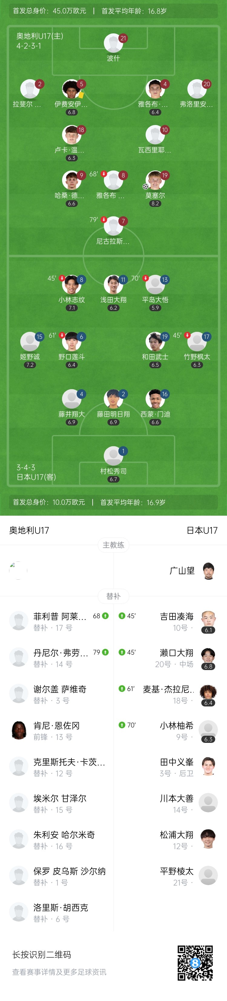伤停补时4分钟。全场比赛结束,奥地利U17以1-0击败日本U17。