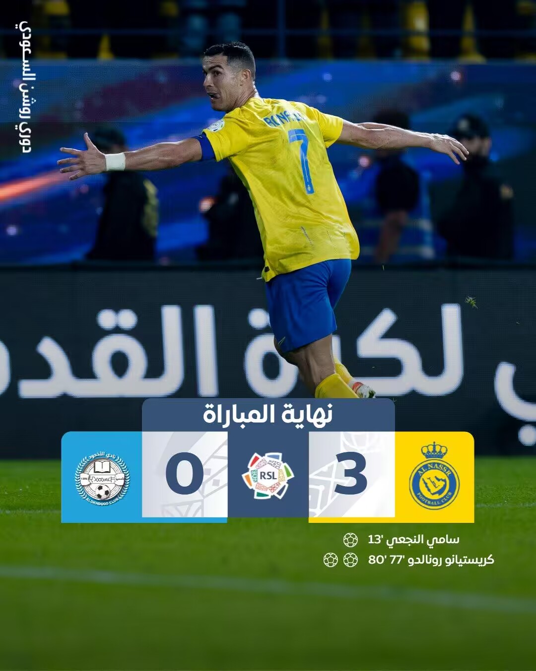 利雅得胜利首发:36-纳贾尔、2-哈纳姆、4-法蒂尔、5-阿姆里、15-特莱斯(93'16-马兰)、6-塞科-福法纳(54'77-布罗佐维奇)、25-奥塔维奥(88'19-哈桑)、14-纳吉(55'23-叶海亚)、29-加里卜(55'8-苏莱希姆)、94-塔利斯卡、7-C罗