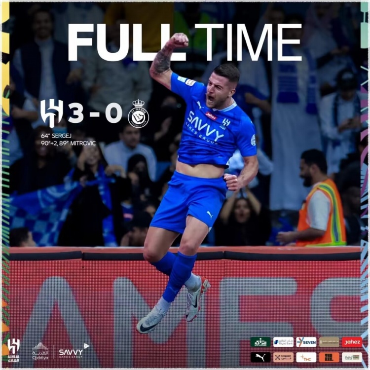 第92分钟,新月的定位球开出,米林科维奇头球摆渡,米特洛维奇冷静扣球推射得手,利雅得新月3-0利雅得胜利!↓