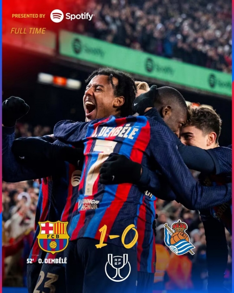 全场比赛结束,最终巴萨1-0击败十人皇家社会,挺进半决赛。