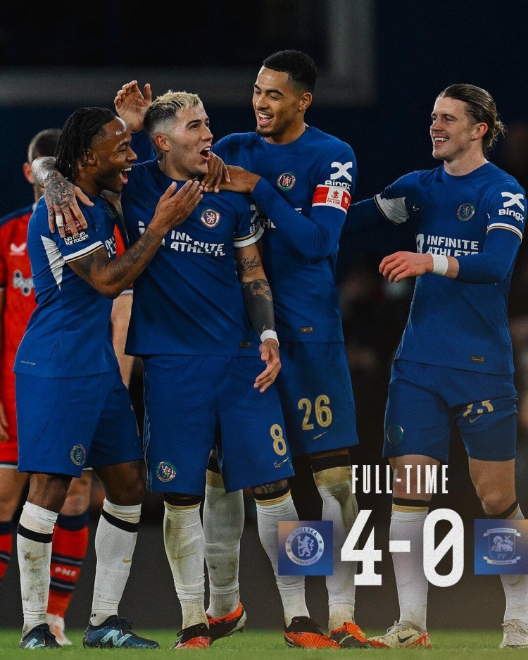 1月7日讯北京时间1月7日凌晨1:30,足总杯第3轮,切尔西主场迎战普雷斯顿,上半场,双方都未能把握住进球机会,互交白卷,半场战罢,切尔西暂0-0普雷斯顿;下半场,布罗亚头球破门为切尔西首开纪录,随后席尔瓦替补登场头球破门扩大比分优势,斯特林任意球直接破门再下一城,恩佐破门锁定胜局!全场比赛结束,切尔西4-0普雷斯顿晋级32强!
