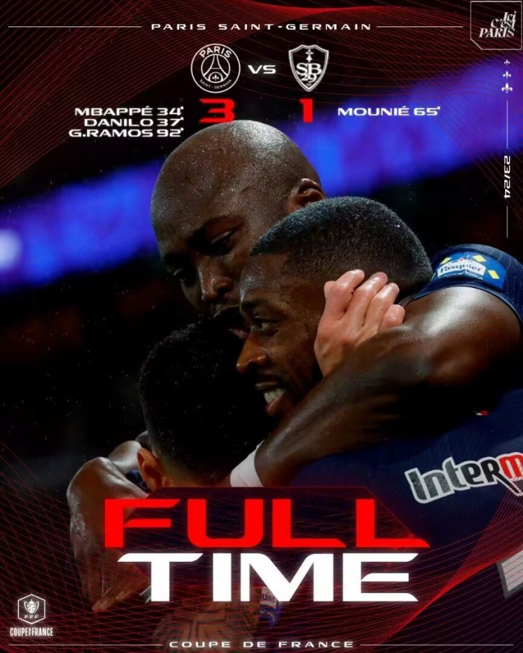 2月8日讯 北京时间2月8日凌晨4时10分,法国杯八分之一决赛,巴黎主场迎战布雷斯特。上半场,姆巴佩首开纪录,达尼洛-佩雷拉扩大领先优势。巴黎半场2-0领先布雷斯特。下半场,穆涅扳回一城,随后布拉西耶两黄一红被罚下,贡萨洛-拉莫斯补时阶段破门。最终巴黎3-1击败布雷斯特,晋级法国杯8强。