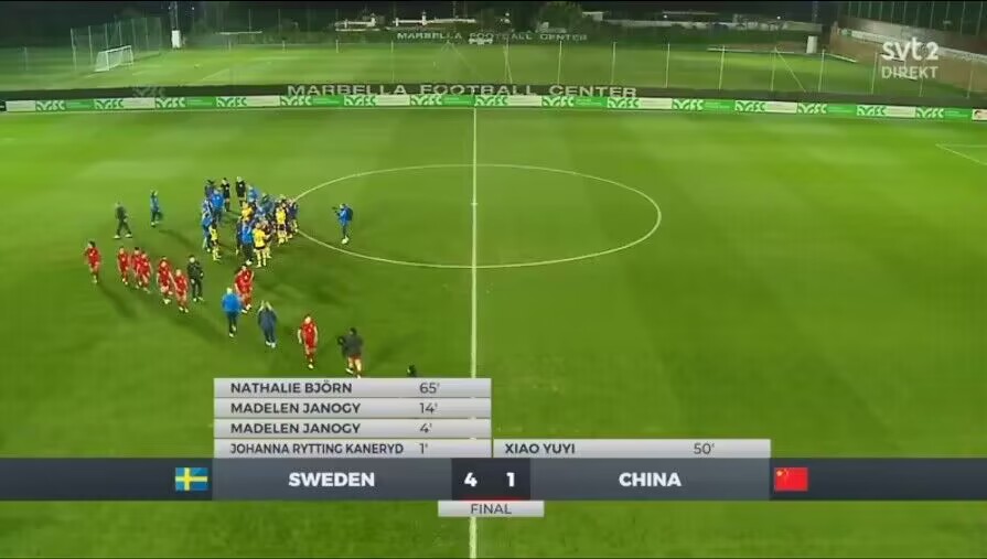 2月17日讯 北京时间2月17日01:30,国际足球友谊赛中国女足挑战瑞典女足的比赛,上半场中国女足开场3分钟丢2球,亚诺吉2射1传,下半场肖裕仪头球扳回一城,比约恩建功,最终中国女足1-4瑞典女足。