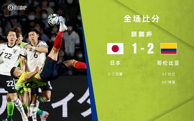3月28日讯北京时间3月28日18:20,麒麟杯,日本对战哥伦比亚。上半场,三笘薰开场3分钟头球闪击,马查多助攻杜兰破门扳平比分。下半场,博雷倒钩破门反超比分,巴尔加斯多次扑救力保球门不失!全场比赛结束,日本1-2哥伦比亚!