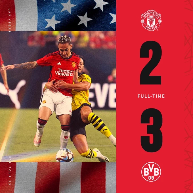 7月31日讯 北京时间7月31日09:00,足球友谊赛曼联迎战多特的比赛,上半场范德贝克助攻达洛特世界波破门,马伦一分钟内连进两球逆转,半场结束,曼联1-2多特蒙德。下半场安东尼推射扳平比分,穆科科替补建功,最终曼联2-3不敌多特。